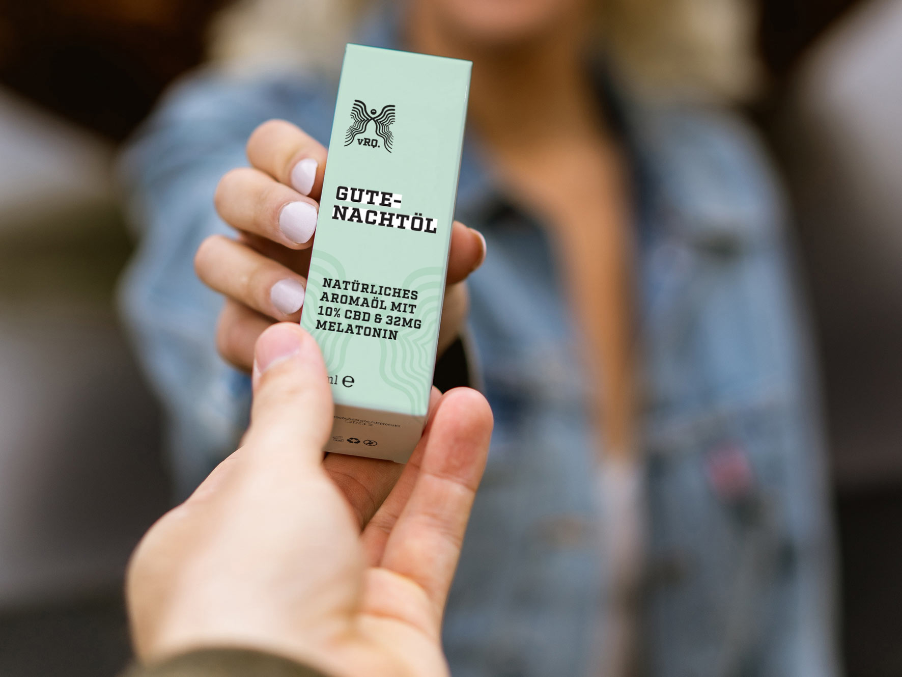 - vRQ CBD Gutenachtöl: This product contains 32 mg of melatonin, designed to promote deep rest and ensure a good night’s sleep. The packaging emphasizes its calming and restful benefits, making it an attractive choice for those seeking improved sleep quality.